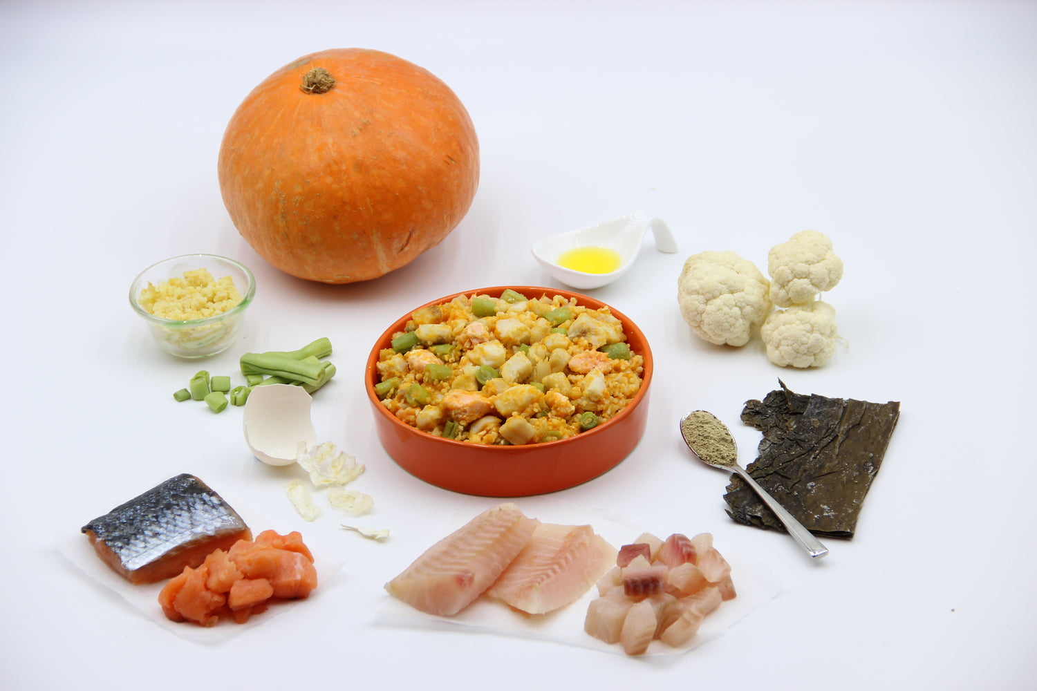 Norwegian Salmon, Vietnamese Tilapia, Pumpkin, Green Bean, Cauliflower, Millet, Brown Rice, Cold-Pressed Flaxseed Oil, Organic Sunflower Oil, Eggshell Powder, Eggshell Membrane, Organic Kelp Powder